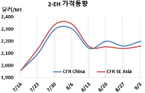 표, 그래프: <2-EH 가격동향> <화학저널 2021/09/08> |