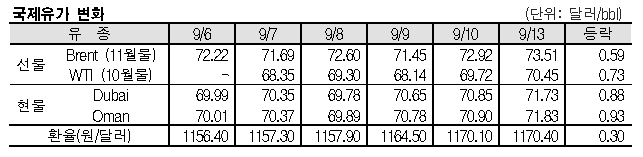 9월13일 국제유가는 미국 멕시코만의 생산 차질 지속 영향으로 상승했다. 9월13일 국제유가는 미국 멕시코만의 생산 차질 영향으로 상승했다. 표, 그래프: <국제유가 변화> <화학저널 2021/09/14> |