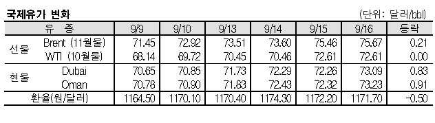 9월16일 국제유가는 수요 증가 기대 영향으로 상승했다. 9월16일 국제유가는 글로벌 석유 수요 증가에 대한 기대 영향으로 상승했다. 표, 그래프: <국제유가 변화> <화학저널 2021/09/17> |