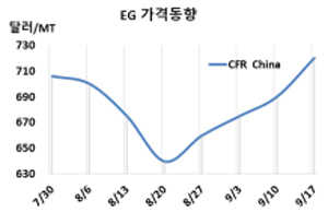 MEG 시세는 9월17일 CFR China 톤당 720달러로 30달러 상승했고 CFR SE Asia 역시 725달러로 30달러 올랐다.