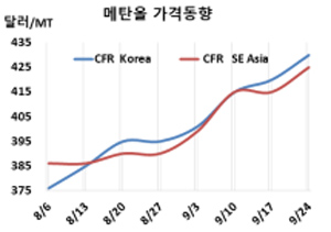 표, 그래프: <Methanol 가격동향> <화학저널 2021/10/01> |