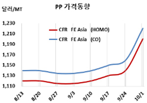 아시아 PP 시세는 9월29일 CFR FE Asia가 라피아(Raffia) 및 인젝션(Injection) 그레이드 1200달러, IPP Film 및 BOPP 1215달러, 블록 코폴리머(Block Copolymer) 1220달러로 각각 60달러 폭등했다. CFR SE Asia는 라피아 1240달러, 인젝션 1235달러, IPP Film 1250달러, BOPP 및 블록 코폴리머 1250달러로 각각 25-30달러 상승했다.