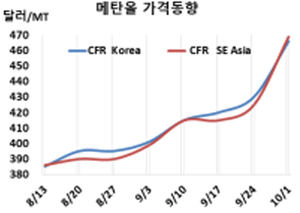 CFR Korea 466달러로 36달러 폭등 … 석탄 공급부족 후유증