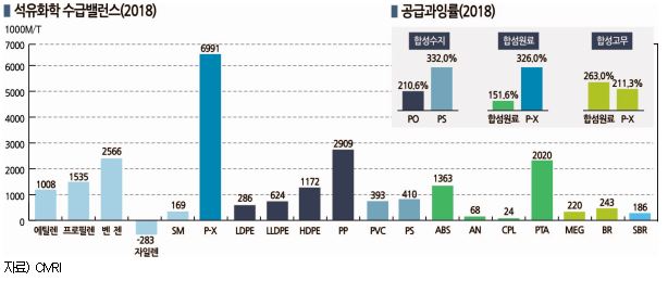 전체적으로 공급과잉이 뚜렷한 가운데 중간 유도제품인 P-X(Para-Xylene)는 공급과잉이 약 700만톤으로 과잉률이 326.0%에 달하고 있다.