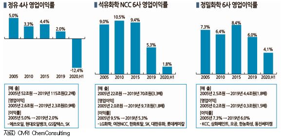 정유도 에쓰오일, 현대오일뱅크, GS칼텍스, SK에너지 4사 모두 수익률이 2005년 5.0%에서 2019년 2.0%로 떨어졌고, 2020년 1분기에는 마이너스 12.4%로 최악을 나타냈다.