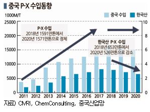 중국은 P-X 수입량이 2018년 1591만톤에서 2020년 1571만톤으로 감소했고, 한국산 수입량은 2018년 653만톤에서 2020년 526만톤으로 급감한 것으로 나타났다.
