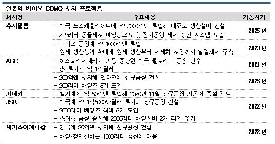 세키스이케미칼(Sekisui Chemical)도 2021년 바이오 CDMO 사업 성장을 자신하고 있으며, Mitsubishi Gas Chemical(MGC)은 Nippon Kayaku와 합작으로 바이오 CDMO 사업을 영위하고 있는 가운데 앞으로 3년간 풀가동을 유지할 계획이다.