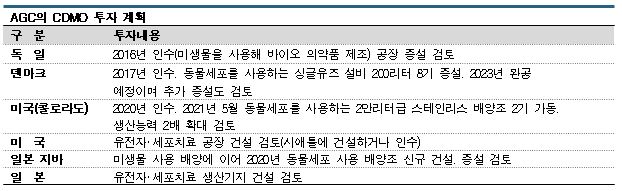 AGC는 2016년 바이오의약품 원제를 생산하는 독일 CDMO 메이저를 인수한 후 M&A를 잇따라 실시하며 일본, 유럽, 미국의 생산기지를 확보했고, 설비투자를 통해 소량다품종 생산에 적합한 수지백을 사용하는 싱글유즈 설비를 중심으로 생산능력을 확대하고 있다.