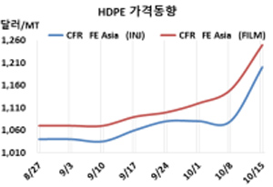 표, 그래프: <HDPE 가격동향> <화학저널 2021/10/18> |