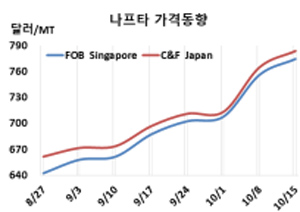 표, 그래프: <Naphtha 가격동향> <화학저널 2021/10/18> |