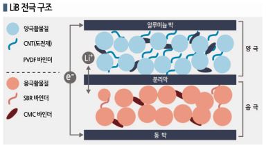 LiB 양극재에는 카본블랙 분산제가 주로 사용되고 있으나 최근에는 전기자동차(EV)의 1회 충전당 주행거리 연장과 배터리 고용량화에 따라 도전성이 높은 CNT 분산제를 사용하는 흐름이 본격화되고 있다.