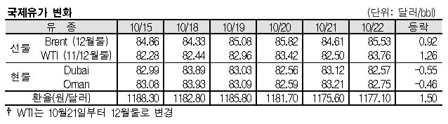 10월22일 국제유가는 수요 증가 및 공급부족 전망 영향으로 상승했다. 10월22일 국제유가는 이동제한 해제 등 각국의 방역조치 완화에 따라 석유제품 수요가 증가한 영향을 받아 상승했다. 표, 그래프: <국제유가 변화> <화학저널 2021/10/25> |