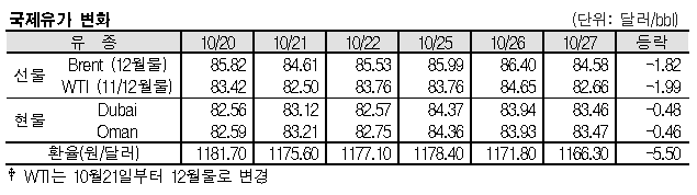 10월27일 국제유가는 미국의 원유 재고가 예상과 달리 증가한 영향으로 폭락했다. 표, 그래프: <국제유가 변화> <화학저널 2021/10/28> |