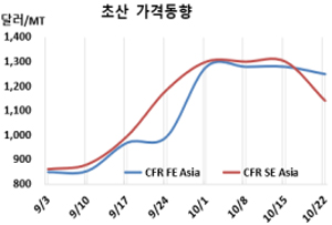 표, 그래프: <초산 가격동향> <화학저널 2021/10/29> |