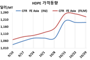 표, 그래프: <HDPE 가격동향> <화학저널 2021/11/01> |