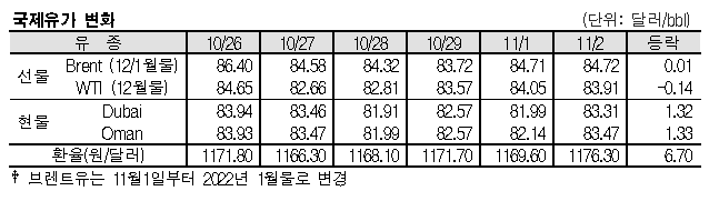 11월2일 국제유가는 OPEC(석유수출국기구)+ 회의를 앞두고 소폭 상승했다. 11월2일 국제유가는 미국의 원유 재고 증가 예상과 달러화 강세가 하락요인으로 작용했으나 OPEC+ 회의를 앞두고 관망세를 나타냈다. 표, 그래프: <국제유가 변화> <화학저널 2021/11/03> |