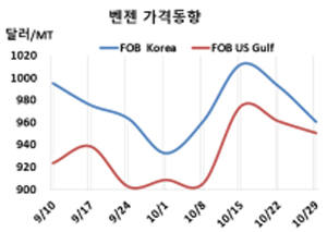 표, 그래프: <Benzene 가격동향> <화학저널 2021/11/03> |