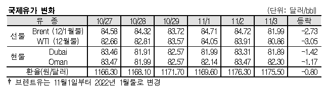 11월3일 국제유가는 미국의 원유 재고 증가 영향으로 폭락했다. 11월3일 국제유가는 미국의 원유 재고가 증가한 영향으로 폭락했다. 표, 그래프: <국제유가 변화> <화학저널 2021/11/04> |