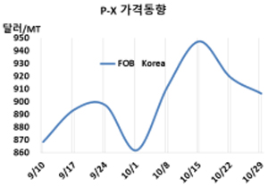 P-X(Para-Xylene)는 메이저들이 무리한 요구를 거두지 않으면서 파행이 계속되고 있다. 표, 그래프: <P-X 가격동향> <화학저널 2021/11/04> |
