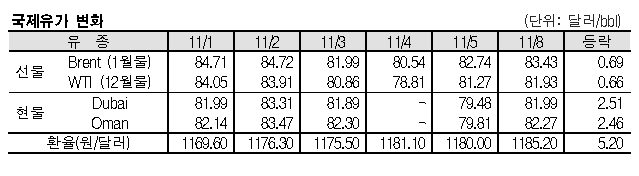 11월8일 국제유가는 미국의 인프라 법안 통과 영향으로 상승했다. 11월8일 국제유가는 미국 하원에서 1조달러의 인프라 투자 법안이 통과됨에 따라 상승했다. 표, 그래프: <국제유가 변화> <화학저널 2021/11/09> |