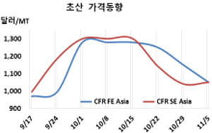 표, 그래프: <초산 가격동향> <화학저널 2021/11/12> |