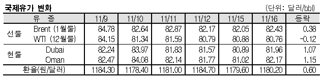 11월16일 브렌트유(Brent)는 유럽의 가스 가격이 급등한 영향으로 상승했다. 11월16일 브렌트유는 독일 Nord Stream 2 승인 연기에 따른 유럽 가스 가격 급등으로 상승했다. 표, 그래프: <국제유가 변화> <화학저널 2021/11/17> |
