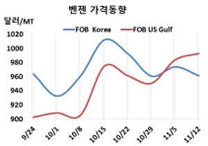 표, 그래프: <Benzene 가격동향> <화학저널 2021/11/17> |