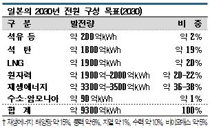 일본은 전원의 재생에너지 비율 목표를 22-24%로 설정하고 있으나 2030년을 목표로 하는 제6차 에너지 기본계획안에서는 36-38%로 대폭 높여 조정했다. 새롭게 포함한 수소, 암모니아는 약 1%로 설정했으며 원자력은 20-22%로 현행대로 유지했다.