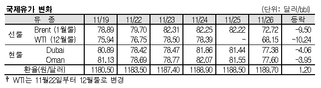 11월26일 국제유가는 코로나19(신종 코로나바이러스 감염증) 신규 변이 오미크론의 출현으로 폭락했다. 11월26일 국제유가는 코로나19 오미크론 변이 출현 영향으로 폭락했다. 표, 그래프: <국제유가 변화> <화학저널 2021/11/29> |