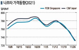 나프타 현물가격은 11월26일 국제유가가 브렌트유 기준 배럴당 72.72달러로 10달러 가까이 대폭락했음에도 불구하고 C&F Japan 720달러로, 700달러를 유지했다.