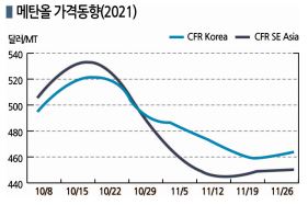 메탄올 현물가격은 11월26일 CFR Korea 465달러, CFR SE Asia 452달러로 상승했고, CFR India는 11월12일 320달러로 29달러, CFR China는 315달러로 45달러 폭락했으나 곧 반등했다.