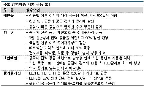 최근 세계 각국이 경제활동을 재개하며 글로벌 에너지 코스트가 상승한 가운데 중국의 전력난, 물류 혼란, 반도체 공급 부족이 겹치면서 석유화학제품 가격이 예상을 훨씬 뛰어넘는 속도로 빠르게 상승하고 있다.