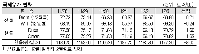 12월3일 국제유가는 OPEC(석유수출국기구)+의 증산 중단 가능성으로 상승했다. 12월3일 국제유가는 OPEC+의 증산 계획이 일시 중단될 가능성이 제기됨에 따라 상승했다. 표, 그래프: <국제유가 변화> <화학저널 2021/12/06> |