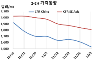 2-EH 현물가격은 12월2일 CFR China가 톤당 1530달러로 80달러 폭락했으나 CFR SE Asia는 1810달러로 30달러 하락에 그쳤다.