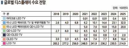 LCD TV는 2028년 수요가 2억6000만-2억7000만대에 달할 것으로 예상되고 있으나 OLED TV는 약 1700만대로 LCD TV의 5% 수준에 그쳐 대형 패널 시장에서 LCD가 압도적인 비율을 차지할 것이 확실시되고 있다.