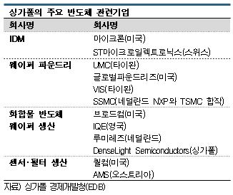 싱가폴은 미국 마이크론(Micron), 스위스 ST마이크로일렉트로닉스(STMicroelectronics) 등 IDM(Integrated Device Manufacturer) 뿐만 아니라 타이완 UMC, 미국 글로벌파운드리스(GlobalFoundries)를 포함한 칩 생산기업이 생산체제를 구축하고 있어 반도체가 제조업의 핵심산업으