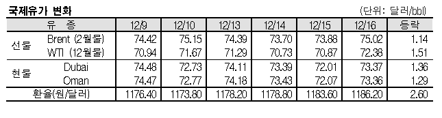 12월16일 국제유가는 미국의 꾸준한 수요 영향으로 상승했다. 12월16일 국제유가는 미국의 꾸준한 수요와 원유 재고 감소 영향으로 상승했다. 표, 그래프: <국제유가 변화> <화학저널 2021/12/17> |
