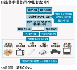 일본은 과거에도 폐기물처리법과 자원유효이용촉진법 등을 통해 순환사회 전환을 준비해왔으며 일부 품목은 용기포장리사이클법, 가전리사이클법, 자동차리사이클법을 통해 유효이용을 의무화하고 있다.