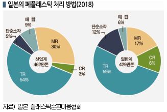 2017년에는 775만톤, 2018년에는 750만톤을 기록한 가운데 TR(Thermal Recycling)에 502만톤, MR(Material Recycling)에 208만톤, CR(Chemical Recycling)에 39만톤을 투입했다.