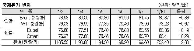 1월10일 국제유가는 위험자산 기피심리 영향으로 하락했다. 1월10일 국제유가는 위험자산 기피심리 영향으로 하락했다. 표, 그래프: <국제유가 변화> <화학저널 2022/01/11> |