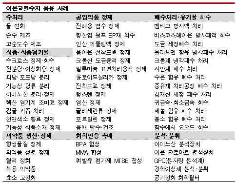 최근에는 초순수 뿐만 아니라 반도체용 전자소재 정제용 수요도 호조가 이어지고 있으며 의약품‧생명과학 분야에서는 의약품 원제와 항체 의약품 분리용 수요가 기대되고 있다.