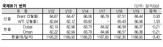 1월19일 국제유가는 공급 차질 우려 영향으로 상승했다. 1월19일 국제유가는 공급 차질 우려 및 수요 증가 전망 영향으로 상승했다. 표, 그래프: <국제유가 변화> <화학저널 2022/01/20> |