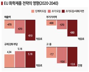 유럽에서 생산되는 화학제품은 2040년 판매액이 규제가 강화되지 않는 때와 비교해 약 12%인 700억유로 가량 감소하고, 특히 최종제품은 접착제, 실란트, 페인트, 세정제에 대한 영향이 클 것으로 분석했다.