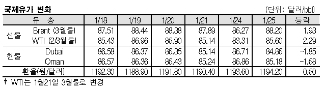 1월25일 국제유가는 지정학적 리스크 심화 영향으로 폭등했다. 1월25일 국제유가는 지정학적 리스크 심화 영향으로 폭등했다. 표, 그래프: <국제유가 변화> <화학저널 2022/01/26> |