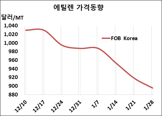 에틸렌(Ethylene)은 900달러가 무너졌다. 에틸렌 시세는 1월28일 FOB Korea 톤당 895달러로 23달러 하락했으나 CFR SE Asia는 995달러로 32달러 상승했다. 특히, CFR NE Asia도 985달러로 57달러 급등했다. 표, 그래프: <에틸렌 가격동향> <화학저널 2022/02/03> |