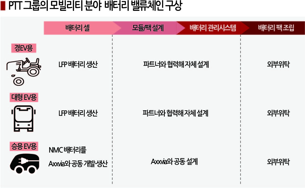 타이 석유공사 PTT 그룹이 전기자동차(EV) 서플라이체인 구축에 나서 주목된다. PTT 그룹은 최근 자회사 글로벌파워에너지(Global Power Energy)가 배터리 공장 가동을 시작했으며 타이의 전기자동차 보급이 본격화될 2030년까지 배터리 생산능력을 10GWh로 300배 이상 확대하는 방안을 검토하고 있다. 표, 그래프: <PTT 그룹의 모빌리티 분야 배터리 밸류체인 구상> <화학저널 2022년 2월 7일> |