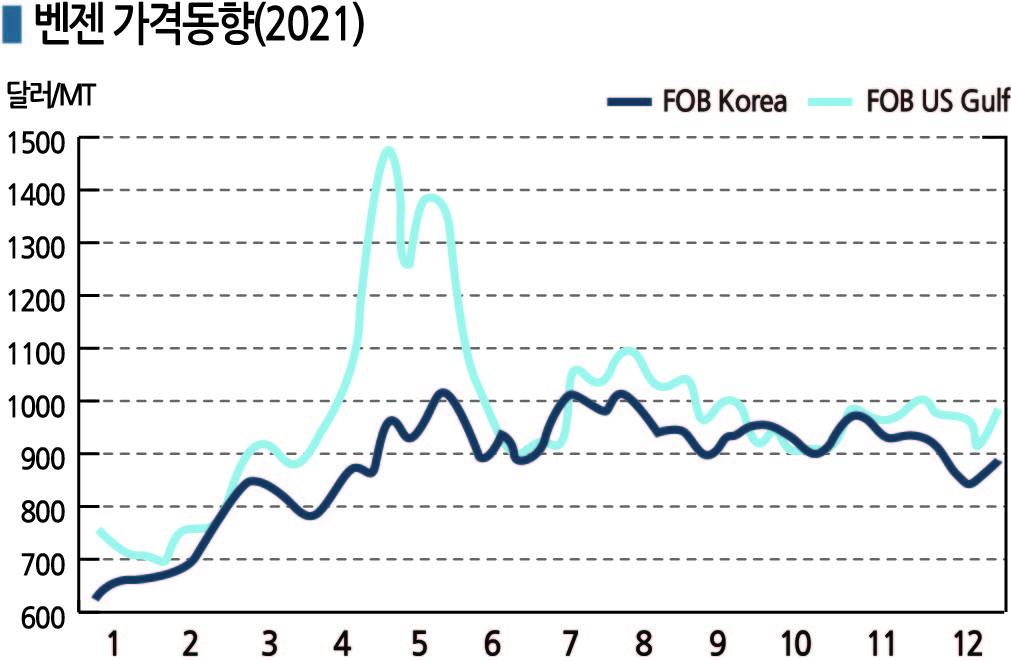 2021년 들어서는 수요 증가 추세가 정착되며 벤젠 현물가격이 900달러 안팎에서 등락하며 강세를 계속했다.