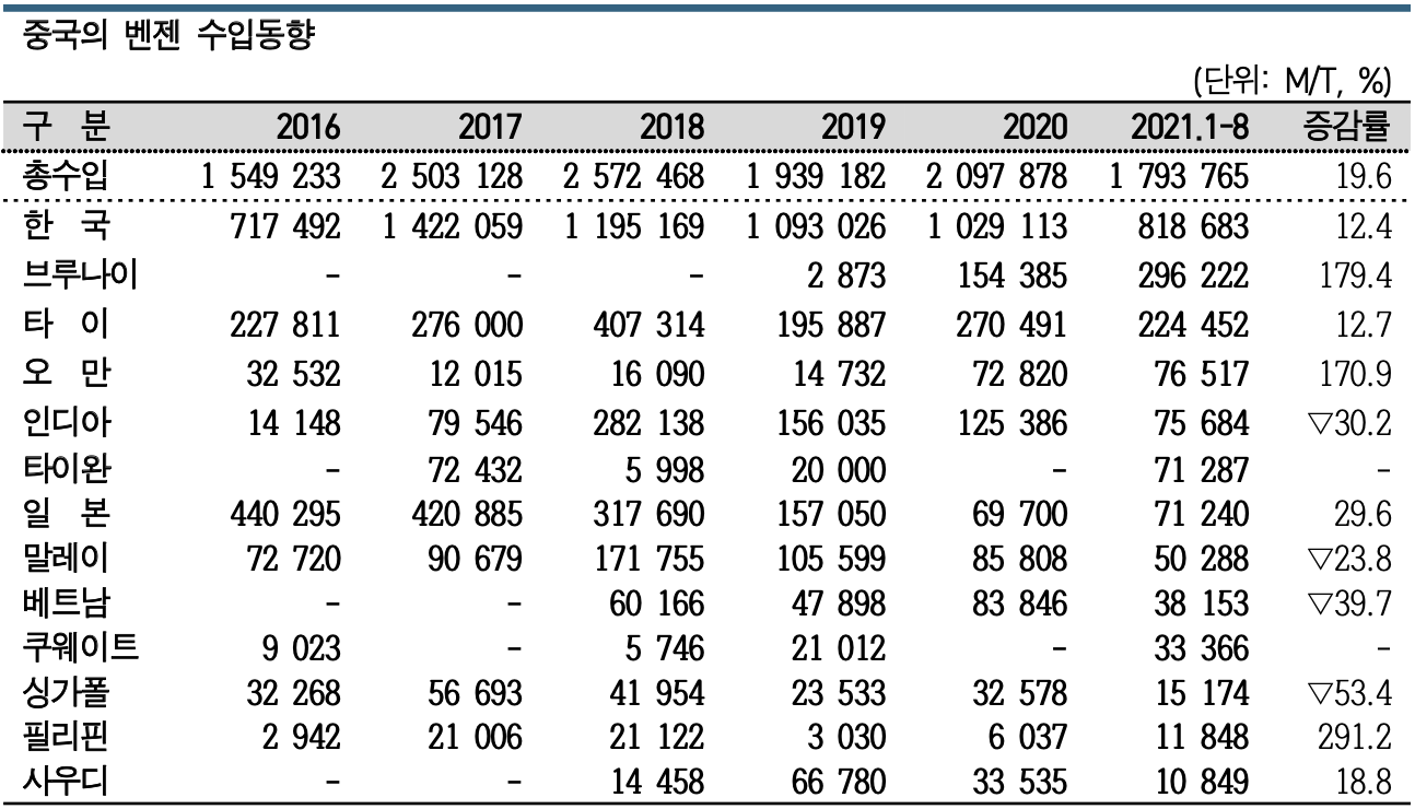 중국은 2021년 1-8월 벤젠 수입량이 179만3800톤으로 19.6% 증가했으나 2020년과 달리 역외물량 유입이 거의 없었던 것으로 파악되고 있다.
