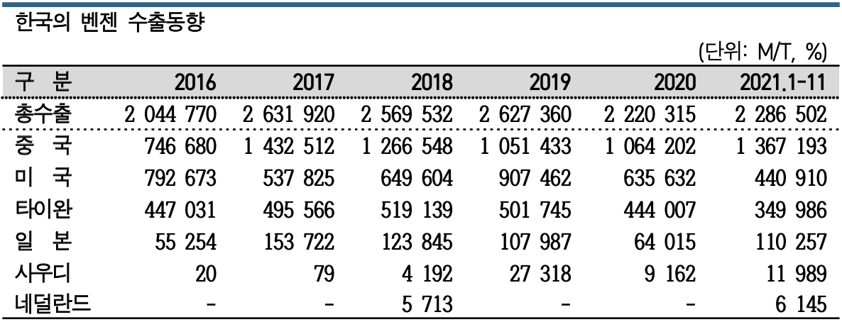 글로벌 벤젠 시장은 2020년 코로나19(신종 코로나바이러스 감염증) 확산으로 경제활동이 침체됨에 따라 수요가 감소했으나 2021년에는 연초부터 중국이 내구소비재 생산에서 코로나19 이전 수준의 가동률을 회복함에 따라 수요가 증가한 것으로 나타났다.