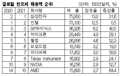 삼성전자가 글로벌 반도체 시장 1위로 등극했다. 표, 그래프: <글로벌 반도체 매출액 순위> <화학저널 2022/02/10> |